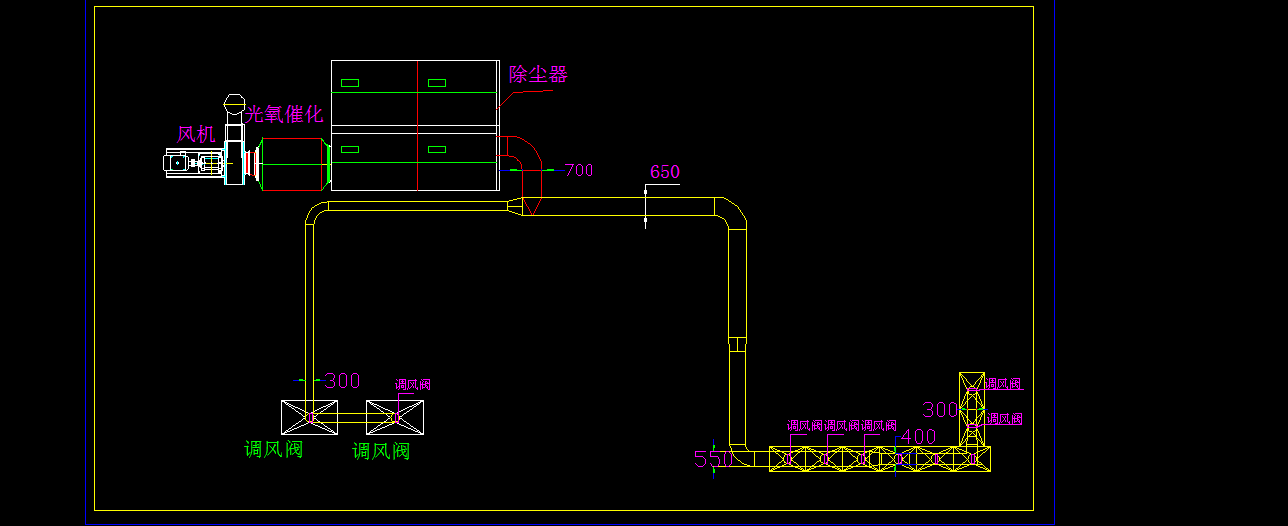 主管道更換為直徑700mm的,各分支管道根據(jù)風(fēng)量的大小相應(yīng)變徑,設(shè)計管道風(fēng)速為20m/s。引風(fēng)機更換為流量不小于20000m3/h,風(fēng)壓不小于3500Pa的。