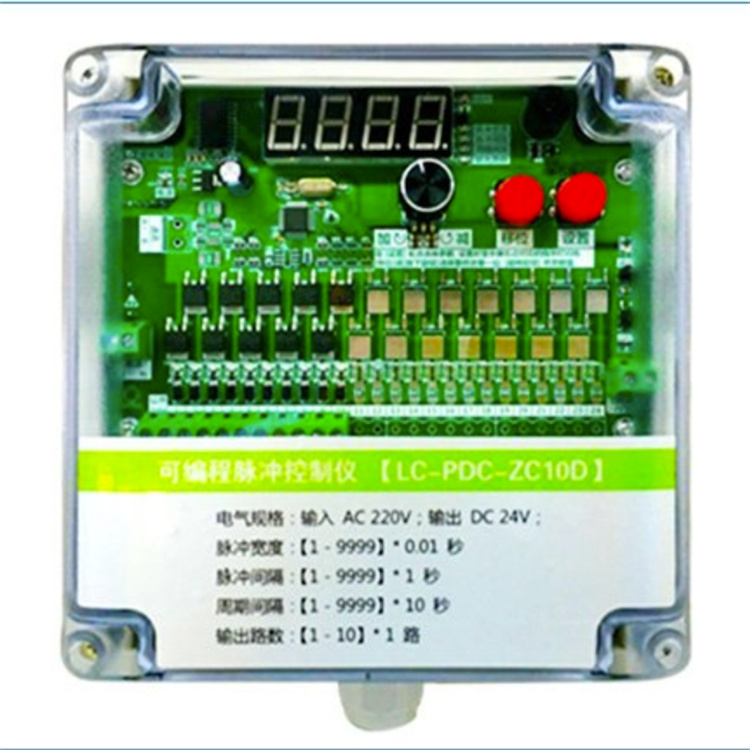 脈沖控制儀上電后默認提升閥關閉時間是5秒,噴吹時間是0.2秒,提升閥延遲復位時間5S,每個氣室間隔時間是60秒,如需調(diào)整,上電后10S內(nèi)可直接設置,第一數(shù)碼管顯示O為調(diào)整多少室循環(huán),按“ZJ”鍵增加室數(shù),(1室—20室循環(huán)可調(diào)),設置好后再按一下“GN”鍵,第一數(shù)碼管顯示1為各室間隔時間,按“ZJ”鍵加時間,,單位是1秒(1s—999s循環(huán)可調(diào)),設置好后再按一下“GN”鍵,第一數(shù)碼管顯示2為提升閥工作時間,按“ZJ”鍵增加時間,單位是1秒(1S—30S循環(huán)可調(diào)),完成后再按一下“GN”鍵,第一數(shù)碼顯示3為噴吹時間,按“ZJ”鍵增加時間,單位是0.1秒(0.1S—5S循環(huán)可調(diào)),完成后再按一下“GN”鍵,第一數(shù)碼管顯示4為延遲多長時間提升閥復位,按“ZJ”鍵增加時間,單位是1秒(1S—30S循環(huán)可調(diào)),完成后停10S本機將自動運行。第一數(shù)碼顯示氣室數(shù),紅數(shù)碼管顯示時間。運行中第一數(shù)碼管顯示“1”為第一個室,顯示“2”為第二個室……