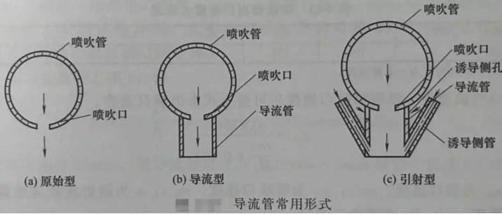 冷吹管上每個噴口下接有一個導流管,可使噴射出的氣流能集中垂直向下。導流管的形狀如下圖所示,其中以C引射型最佳。