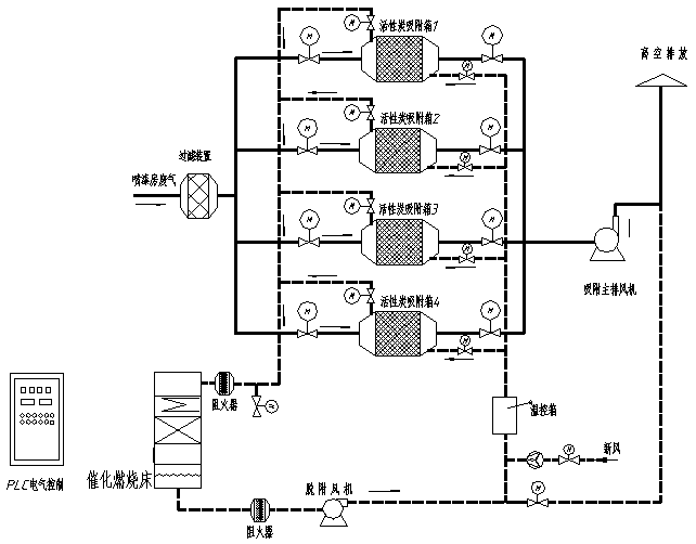 2. 系統(tǒng)由4個(gè)活性炭吸附箱(3用1備),1個(gè)催化燃燒床構(gòu)成,將各條生產(chǎn)線中的所有排氣管合并連接引至凈化設(shè)備,各個(gè)支管上安裝一只手動(dòng)調(diào)節(jié)閥,配比例調(diào)節(jié);廢氣經(jīng)收集匯總后送入集氣箱,再將廢氣送入干式過濾器,干式過濾器能更為精細(xì)的祛除廢氣中的粉塵和漆霧,從而避免活性炭微孔被堵塞,延長(zhǎng)活性炭的使用周期,活性炭吸附器接近飽和時(shí),系統(tǒng)將自動(dòng)切換到備用活性炭吸附箱(此時(shí)飽和活性炭吸附箱停止吸附操作),然后用熱氣流對(duì)飽和活性炭吸附箱進(jìn)行解吸脫附,將有機(jī)物從活性炭上脫附下來。在脫附過程中,有機(jī)廢氣已被濃縮,濃度后的濃度較原濃度提高幾十倍,達(dá)2000mg/m3以上,濃縮廢氣送到催化燃燒裝置,最后被分解成CO2與H2O排出。完成解吸脫附后,活性炭吸附器進(jìn)入待用狀態(tài),待其他活性炭吸附箱接近飽和時(shí),系統(tǒng)再自動(dòng)切換回來,同時(shí)對(duì)飽和活性炭吸附器進(jìn)行解吸脫附,如此循環(huán)工作。最后凈化后的潔凈氣體由主排風(fēng)機(jī)排入大氣中。