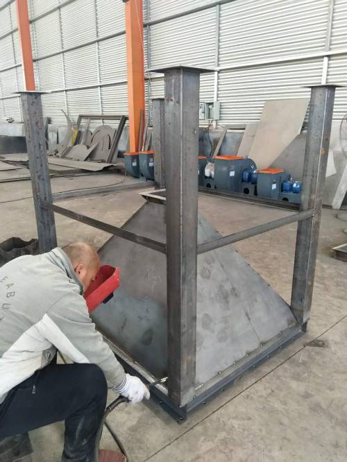 灰斗由上灰斗和下灰斗兩體連接而成,其壁板均采用4mm厚鋼板焊制,外表均焊有足夠強度的角鋼為加強筋?;叶废虏窟€焊有大孔格柵網(wǎng)。檢修換袋時可以從上方將濾袋直接放入灰斗,落在板柵網(wǎng)上,然后從灰斗從孔門處即可統(tǒng)一取出,既減輕工人勞動強度,又實現(xiàn)了清潔操作,深受檢修人員的歡迎。